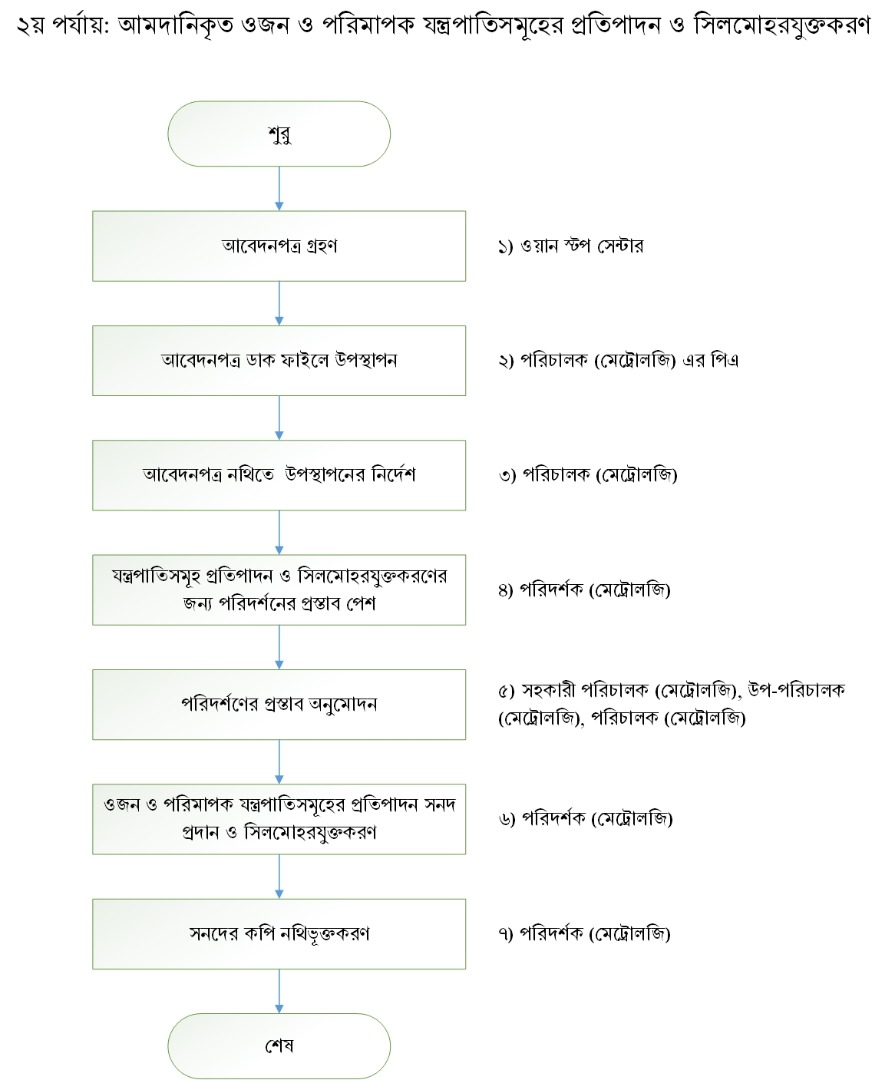 (খ) দ্বিতীয় পর্যায়: আমদানির নিবন্ধন সনদ প্রাপ্তির নিবন্ধনকৃত ওজন ও পরিমাপক যন্ত্রপাতিসমূহ আমদানিকারকের প্রতিষ্ঠান প্রাঙ্গনে আসার পর প্রতিপাদন ও সিলমোহরযুক্তকরণ (Verification and Stamping):